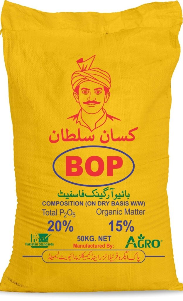 BOP (Bio-Organic Phosphate) Fertilizer is a high-quality bio-organic fertilizer formulated to improve soil health and enhance crop productivity. Manufactured by Pak Agro Fertilizers & Chemicals, it contains a rich source of phosphorus along with organic matter that improves soil structure, increases nutrient availability, and promotes strong root development. BOP helps enhance microbial activity in the soil, supports balanced plant growth, and contributes to sustainable and long-term agricultural fertility.